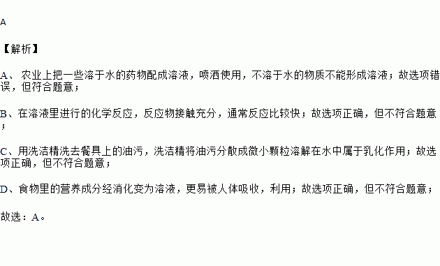 A.农业上把一些不溶于水的药物配成溶液,喷洒使用