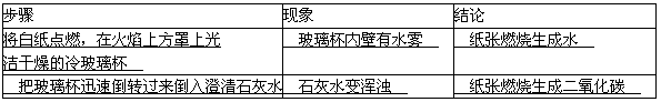 | 迅速把烧杯倒过来,向烧杯注入少量 ,振荡 | 澄清石灰水变 。 | 白纸燃烧有 生成。 |