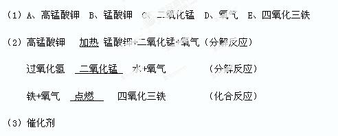 暗紫色固体A在加热的条件下反应生成B和C以及D,常温下过氧化氢溶液遇到C时分解放出D,其中C在反应前后的质量和化学性质都没有改变,若将细铁丝放在D中点燃能剧烈燃烧,火星四射,生成黑色固体E。