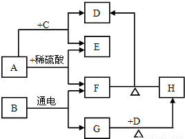解答:解:D是红色固体,则D为铜;B通电能生成F和G,则B为水,F、O为氢气和氧气;C是蓝色溶液,则C溶液中含有铜离子,A是黑色固体,能与铜盐溶液反应,也能与稀硫酸反应,故A为铁粉,F为氢气,G为氧气,C为硫酸铜,E为硫酸亚铁,D为铜;H是氧化铜;氢气与氧化铜反应生成铜;