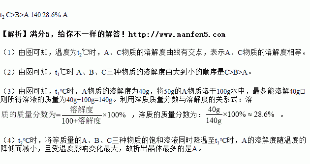 (4)t2℃时,将等质量的A、B、C三种物质的饱和溶液同时降温至t1℃时,析出晶体最多的是_____。
