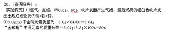 ⑷小明想进一步探究“金戒指”中铜元素的含量,取一枚同材质的“金戒指”,称得质量为3.8g。在老师的指导下,将“金戒指”经浓硝酸氧化、碱化等步骤处理后,最终得到纯净的氧化铜,称得质量仍然为3.8g(实验过程中铜元素损失忽略不计)。则“金戒指”中铜元素的质量分数是多少?(写出计算过程)(4分)