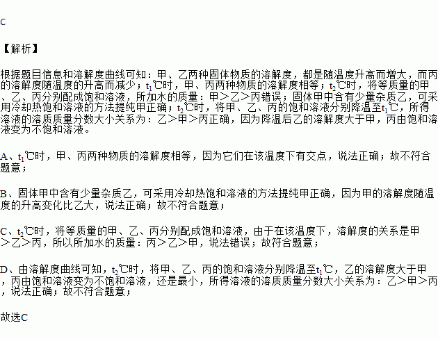 甲、乙、丙三种固体物质(甲、乙、丙均不含结晶水)的溶解度曲线如图所示,下列说法不正确的是( )