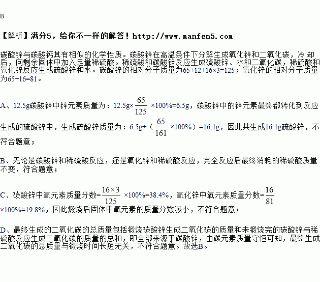 碳酸锌与碳酸钙其有相似的化学性质。现将 12.5g 碳酸锌固体高温锻烧一段时间,冷 却后,向剩余固体中加入足量稀硫酸。下列说法不正确的是( )