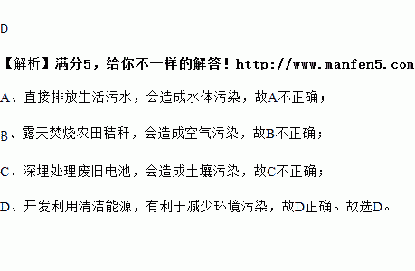 C. 深埋处理废旧电池 D. 开发利用清洁能源