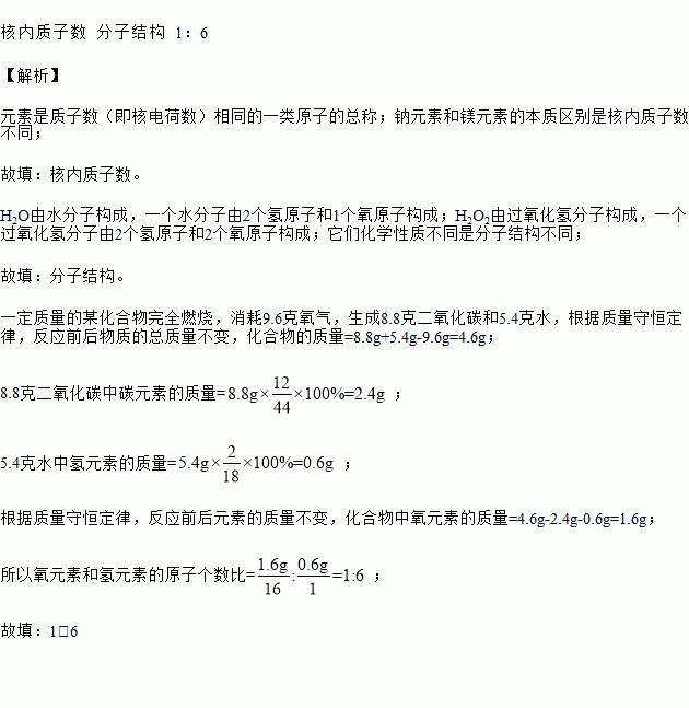 钠元素和镁元素的本质区别是_____不同;H2O和H2O2都是由氢元素和氧元素组成,但是化学性质不同,是因为_____不同。一定质量的某化合物完全燃烧,消耗9.6克氧气,生成8.8克二氧化碳和5.4克水,该化合物中氧元素和氢元素的原子个数比为_____。