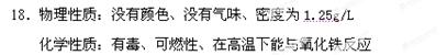 煤气的主要成分是一氧化碳,通常情况下,它是一种没有颜色、没有气味的气体。为了防止煤气中毒,常在煤气里加一些有强烈刺激性气味的气体——硫醚。当煤气泄漏时,人们可以从硫醚的气味觉察到煤气泄漏了,以便及时采取措施。1L一氧化碳约重1.25g左右,密度跟空气接近。一氧化碳燃烧生成二氧化碳。一氧化碳还可以跟铁矿石中的氧化铁在高温条件下反应,生成铁和二氧化碳,从而用于工业冶炼钢铁。