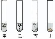 四支试管中盛有相同体积、相同溶质质量分数的稀盐酸,分别同时加入大小、厚薄相同的甲、乙、丙、丁四种金属薄片.观察到的现象如图所示.试回答: