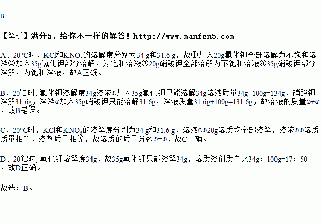 已知:20℃时,KCl和KNO3的溶解度分别为34 g和31.6 g。配制20℃时的如下四种溶液:
