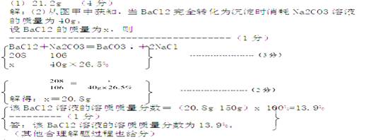 £¨6·Ö£©ÊµÑéÊÒÓÐһƿδ֪Ũ¶ÈµÄBaCl2ÈÜÒº£¬Ä³Í¬Ñ§È¡³ö150g¸ÃÈÜÒºÓÚÉÕ±ÖУ¬ÏòÆäÖÐÖðµÎ¼ÓÈëÈÜÖÊÖÊÁ¿·ÖÊýΪ26.5%µÄNa2CO3ÈÜÒº¡£·´Ó¦¹ý³ÌÖÐÉú³É³ÁµíµÄÖÊÁ¿ÓëËùÓÃNa2CO3ÈÜÒºÖÊÁ¿µÄ¹ØÏµÈçͼ¼×Ëùʾ¡£ÒÑÖª£ºBaCl2£«Na2CO3£½BaCO3¡ý£«2NaCl Çë¼ÆË㣺