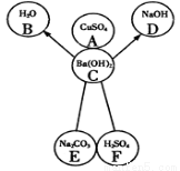 (4分)下图中的六个圆A、B、C、D、E、F分别表示六种物质,蓝色溶液A与C反应能生成两种沉淀,B为氧化物,C、D、E、F分别是碳酸钠溶液、稀硫酸、氢氧化钡溶液和氢氧化钠溶液中的一种,E中溶质可用于生产洗涤剂。用“→”表示一种物质能转化为另一种物质,用两圆相切或“——”表示两种物质可以发生化学反应,六种物质之间的部分反应及转化关系如右图所示。请利用初中化学知识回答下列问题: