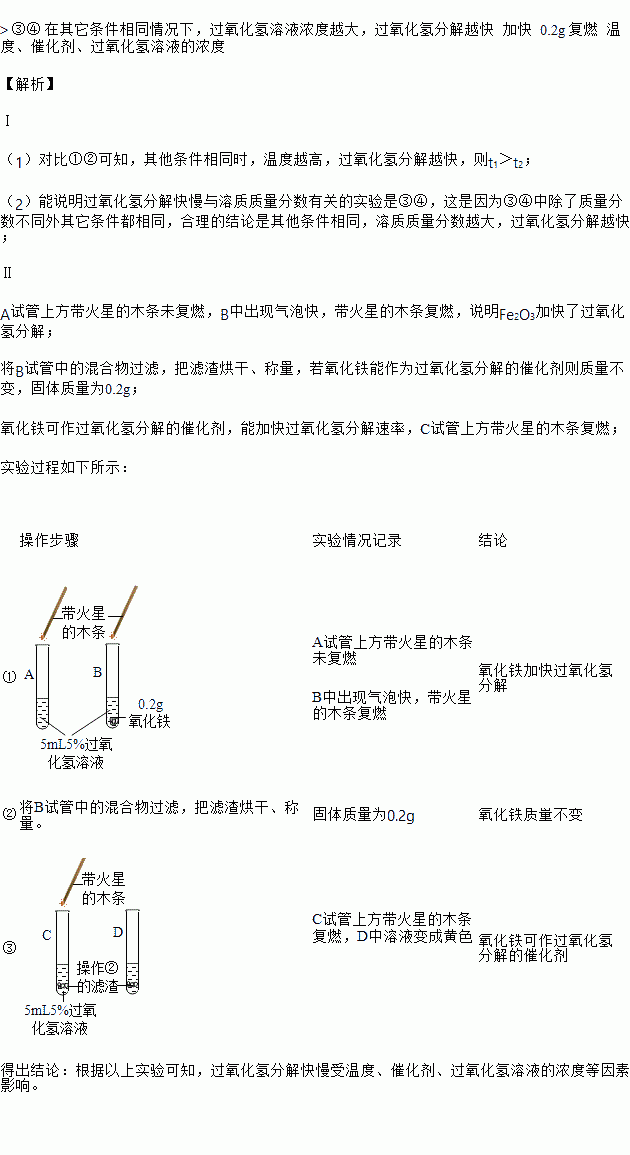 (1)对比①②可知,其他条件相同时,温度越高,过氧化氢分解越快,则t1_____t2(填“>”、 “=”或“<”)