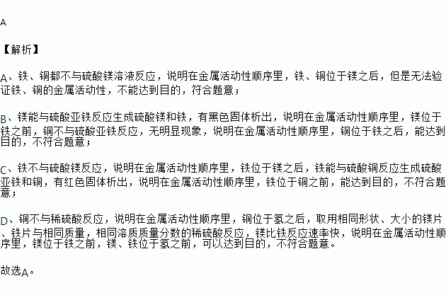 C.Fe、MgSO4溶液、CuSO4溶液 D.Mg、Fe、Cu、稀硫酸