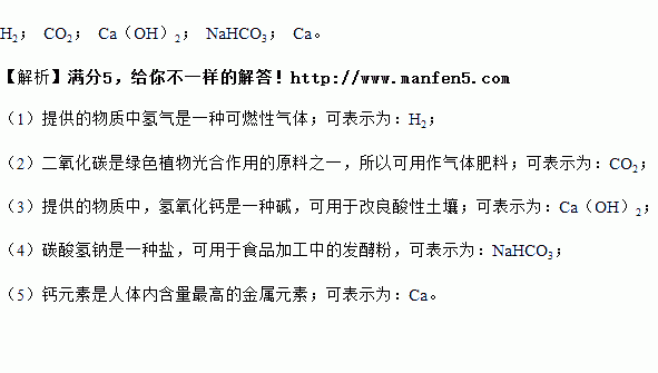 按要求从氢气、氧气、碳酸氢钠、二氧化碳、熟石灰、钙元素、硫酸中选择合适的物质 或元素,将其化学式或符号填写在下列横线上。