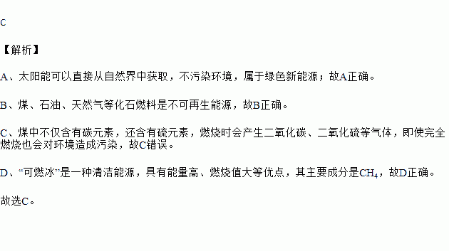 D.可燃冰具有能量高、燃烧值大等优点,其主要成分是CH4