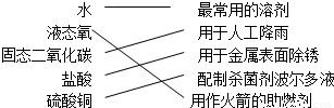 【答案】分析:根据物质的性质回答,水是最常用的溶剂,氧气有助燃性,干冰升华时吸收热量,可用于人工降雨,盐酸能和金属氧化物反应,硫酸铜和熟石灰能陪着农药波尔多液.
