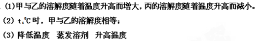 ⑶由于甲的溶解度随温度的升高而增大,且受温度的影响最大,因此使甲从饱和溶液中析出晶体,最好采用降温结晶的方法;而乙的溶解度受温度的影响很小,因此使乙从饱和溶液中析出晶体,最好采用蒸发溶剂的方法;而丙的溶解度随温度的升高而减小,因此使丙从饱和溶液中析出晶体,最好采用升高温度的方法;故答案为:降温结晶法,蒸发溶剂法,升温结晶法。