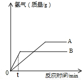解答:解:在金属完全反应前的任一时间内,金属锌与酸反应放出氢气的量应大于铁与酸的反应,反应时间为tmin时,两种金属与酸反应放出氢气情况如图所示.