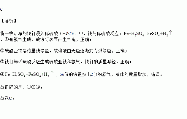 将一枚洁净的铁钉浸入稀硫酸(H2SO4)中,下列叙述中正确的是 。