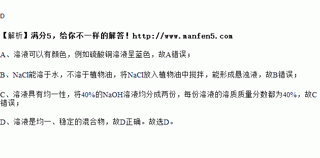 B. 将NaCl放入植物油中搅拌,能形成溶液
