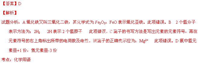 C.镁离子 Mg+2 D.氨中氮元素的化合价NH3中N为+3