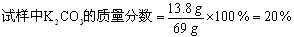 某同学欲测定草木灰中碳酸钾的含量,称取69g试样于烧杯中,加入29.2g稀盐酸恰好完全反应,充分反应后,称得混合物的总质量为93.8g(忽略二氧化碳的溶解对质量的影响)。请计算: