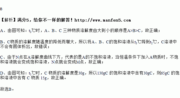 B.将 A、B、C 的饱和溶液从 t3℃降到 t2℃,溶液中均有固体析出