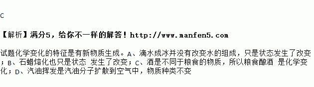 A. 滴水成冰 B. 石蜡熔化 C. 粮食酿酒 D. 汽油挥发
