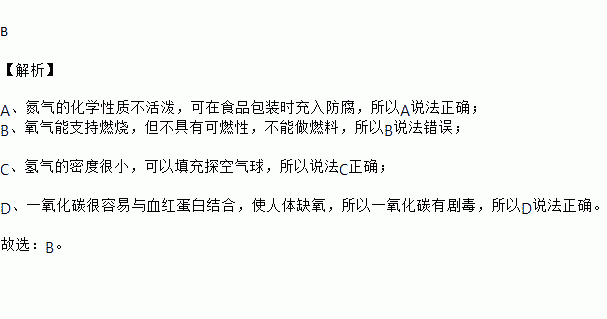 A.氮气的化学性质不活泼,可在食品包装时充入防腐
