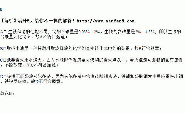 A.生铁和钢的性能不同,因为生铁的含碳量比钢少