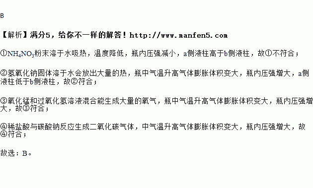 如下图所示,将少量液体 X加入到广口瓶中,关闭活塞,液体 X和固体Y 因发生化学变化而使a侧液柱低于b侧液柱的组合是( )