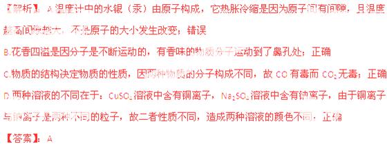 | A | 温度计中的水银(汞)热胀冷缩 | 原子大小发生改变 |