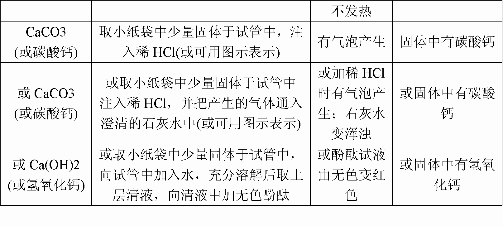 | 将这袋干燥剂放置在空气中一段时间后,看能否继续作干燥剂 | 取足量纸袋中固体放入烧杯中,加入适量水,触摸杯壁 | | 不能作干燥剂 |