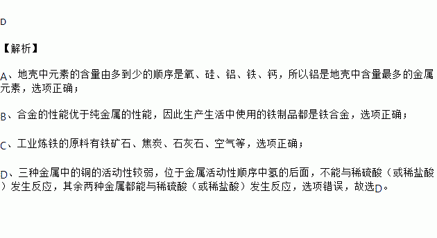 D.三种金属都能与稀硫酸(或稀盐酸)发生反应