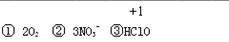 ① 2个氧气分子 ;② 3个硝酸根离子 ;③ HClO中Cl元素的化合价 ;