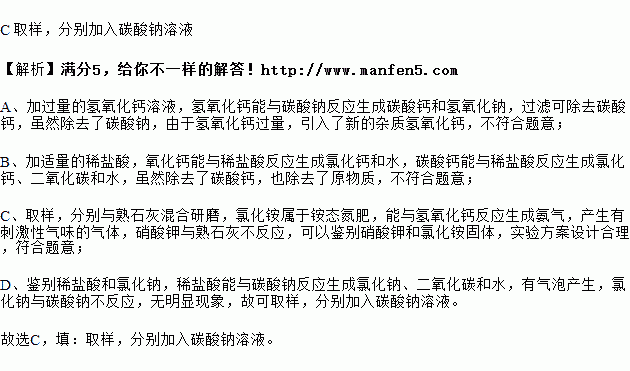 C | 鉴别硝酸钾和氯化铵固体 | 取样,分别与熟石灰混合研磨 |