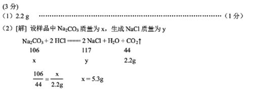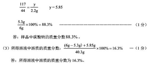 (3分)工业生产的纯碱(Na2CO3)产品中常含有少量的氯化钠(其它杂质忽略不计)。为测定该产品中碳酸钠的质量分数,现称取6g样品放在烧杯中并滴入稀盐酸。当稀盐酸滴加至36.5g时,恰好完全反应,烧杯内溶液的总质量为40.3g(假设产生的气体全部逸出)。(已知:Na2CO3 + 2HCl="=" 2NaCl + H2O + CO2↑)