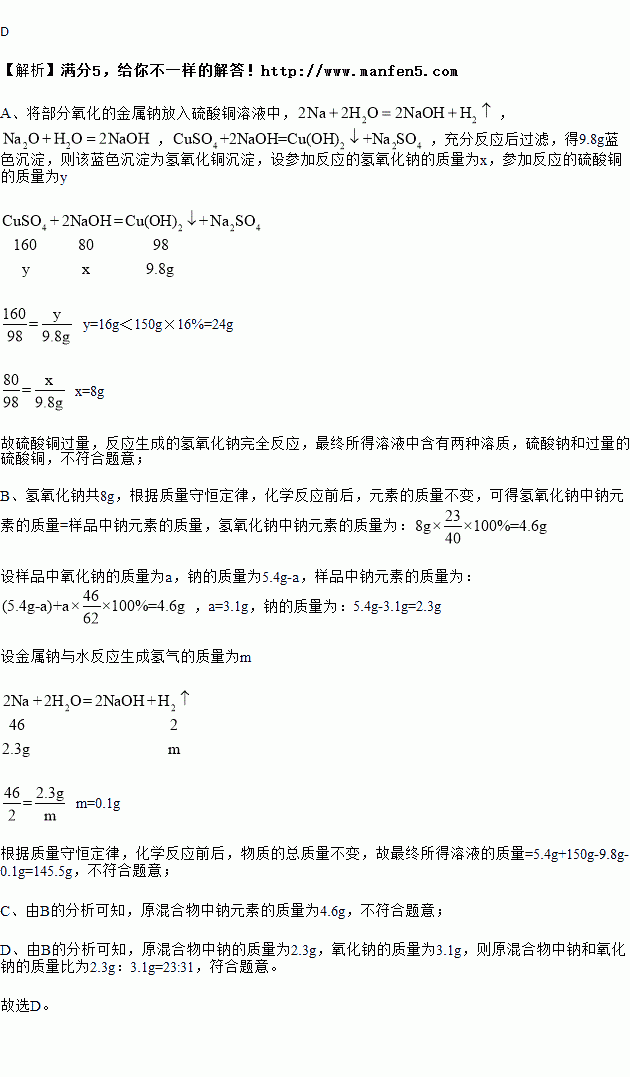 ½ðÊôÄÆ·Ç³£»îÆÃ£¬³£ÎÂÏÂÔÚ¿ÕÆøÖÐÒ×±»Ñõ»¯£¬Ò²Ò×ÓëË®·´Ó¦¡£ÏÖ½«5.4g²¿·ÖÑõ»¯µÄ½ðÊôÄÆÑùÆ··ÅÈë150g 16%µÄÁòËáÍÈÜÒºÖУ¬³ä·Ö·´Ó¦ºó¹ýÂË£¬µÃµ½9.8gÀ¶É«ÂËÔü¡£(ÒÑÖªÑùÆ·³É·Ö½öΪNaºÍNa2O£¬Ïà¹Ø·´Ó¦¢Ù