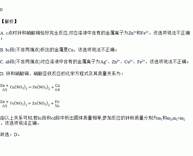 D.若bc段和cd段中析出固体质量相等,参加反应的锌粉质量分别为m1和m2,m1<m2