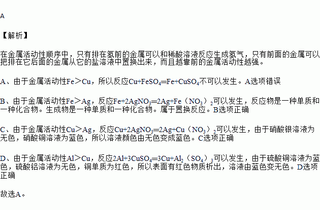 ¸ù¾Ý½ðÊô»î¶¯ÐÔ˳ÐòAl£¾Fe£¾Cu£¾AgÅжϣ¬ÏÂÁÐ˵·¨´íÎóµÄÊÇ£¨¡¡¡¡£©