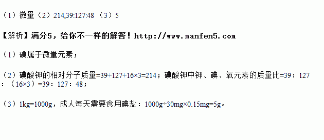 (3)若1kg碘盐中含30mg碘元素。已知成年人每天约需要0.15mg碘,假设这些碘主要从碘盐中摄取的,则成人每天需要食用碘盐多少g 。