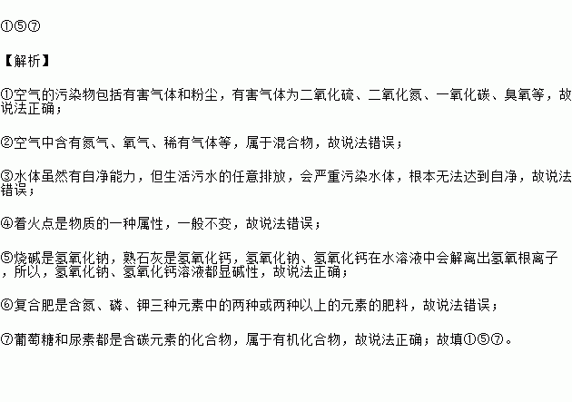 ①二氧化硫和臭氧都是空气污染物;②洁净的空气和水都是纯净物:③因为水体有自净能力,所以生活污水可任意排放;④降低可燃物的着火点是灭火的途径之一;⑤烧碱和熟石灰的溶液都显碱性;⑥复合肥中一定要含有氮、磷、钾三种元素;⑦如果将化合物按有机化合物和无机化合物两大类划分,则葡萄糖和尿素应属于有机化合物。其中正确的是_____。