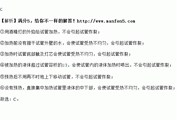 用酒精灯给试管里的液体加热时,发现试管破裂,可能原因有:①用酒精灯的外焰给试管加热;②加热前试管外壁的水没有擦干;③加热时试管底部触及灯芯;④被加热的液体超过试管容积1/3;⑤加热时没有不时地上下移动试管;⑥没有进行预热,直接集中加热试管里液体的中下部,其中与之相关的是( )