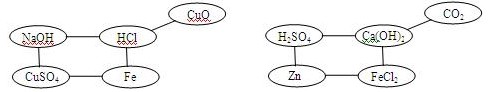 整理、归纳物质性质之间的相互联系,是化学学习的一种有效方法。小丽在复习单质、氧化物、酸、碱、盐性质时,构建了以下知识网络图,图中短线“--”表示相连的两种物质能在一定条件下发生反应。我能帮小丽在单质、氧化物、酸、碱、盐五类物质中分别选取一种物质,将它们的化学式填写在下图圆圈中,并符合以上要求。