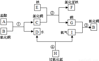因此:(1)E为铁; H为过氧化氢,化学式为:H2O2;X是过氧化氢分解的催化剂,起到催化作用;(2)反应②是铁和氯化铜反应产生氯化亚铁和铜,故反应的方程式为:Fe+CuCl2═Cu+FeCl2;
