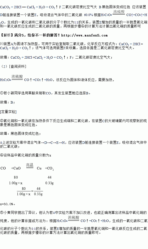 ②小颖同学先用电子秤称取了1.00g氧化铜样品,放入装置C中的玻璃管内并组装好所有相关仪器,再将草酸分解得到的气体产物按照以下仪器的连接顺序进行实验:混合气体→D→C→E→H,最后,通过测量反应前后装置E的质量变化进行计算。(已知:CO+CuO