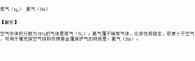请用适当的化学用语填空:空气中体积分数为78%的气体是_____;可用于填充探空气球和作焊接金属保护气的物质是___。