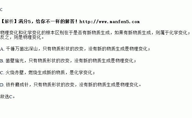 A.千锤万凿出深山 B.凿壁偷光 C.火烧赤壁 D.铁杵磨成针