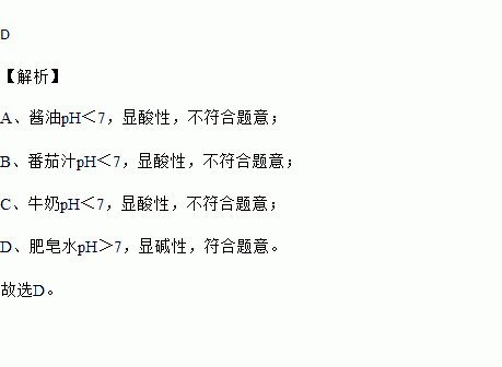 C.牛奶 pH:6.3-6.6 D.肥皂水 pH:9.5-10.5