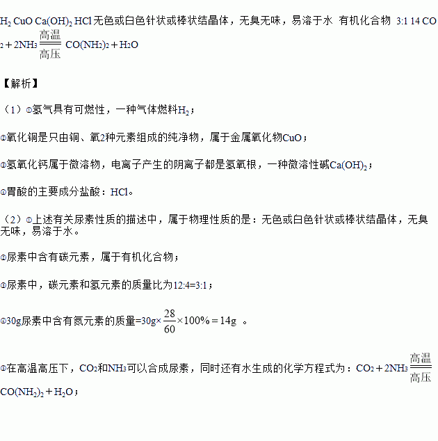 (2)尿素,又称碳酰胺,化学式为CO(NH2)2,外观为无色或白色针状或棒状结晶体,无臭无味,易溶于水,对热不稳定,在酸、碱、酶作用下能水解生成氨和二氧化碳。它是动物蛋白质代谢后的产物,通常用作植物的有机态氮肥。尿素是重要的有机化工原料,可以作为三聚氰胺、脲醛树酯、咖啡因、味精等多种产品的生产原料,它还广泛应用于医药、农药、化妆品、塑料等领域。